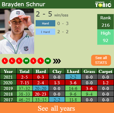 Schnur has a 2-5 win-loss record in 2021, 2-2 on indoor hard courts (See FULL STATS).