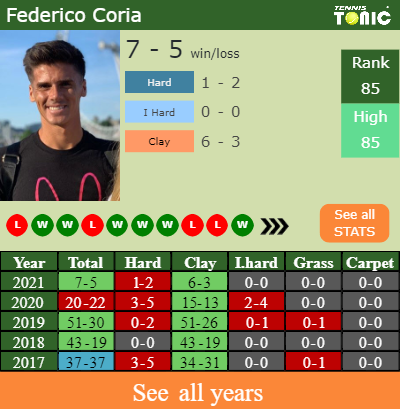 Coria has a 7-5 win-loss record in 2021, 6-3 on clay (See FULL STATS).