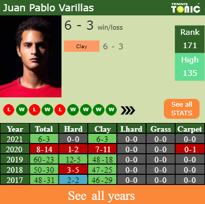 Juan has a 6-3 win-loss record in 2021, 6-3 on clay (See FULL STATS).
