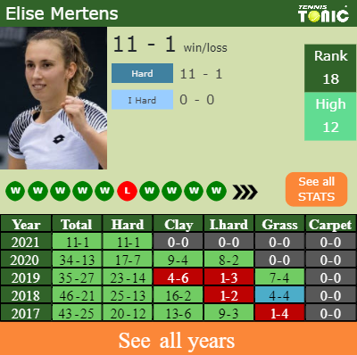 Elise has a 11-1 win-loss record in 2021, 11-1 on hard (See FULL STATS).