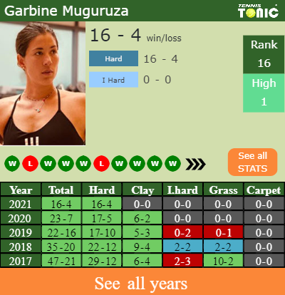Muguruza has a solid win-loss record in the last 10 years having won 66% of her matches (321-169). 16-4 on hard in 2021. Regarding her performance on the same surface of this competition, Muguruza has a 190-95 record in the last years on hard.