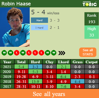 Haase has a positive record in the last 10 years having won 52% of his matches (268-249). 2-1 on indoor hard courts in 2021. Talking about his performance on the same surface of this tournament, Haase has a 54-52 match record in the last years on indoor hard courts.