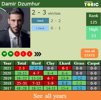 Damir has a 2-3 win-loss record in 2021, 2-2 on hard (See FULL STATS).