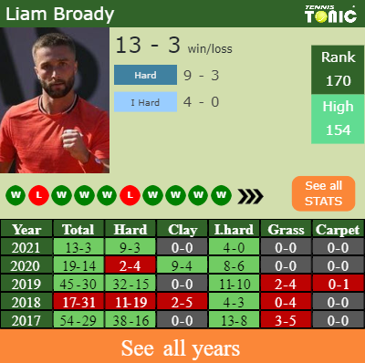 Broady started his run at this tournament from the qualifications. In the main draw, he hasn’t surrendered yet a set in this competition to conquer 55% of the points he played.