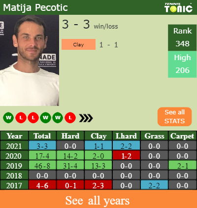 Pecotic has a 3-3 win-loss record in 2021, 2-2 on indoor hard courts (See FULL STATS).