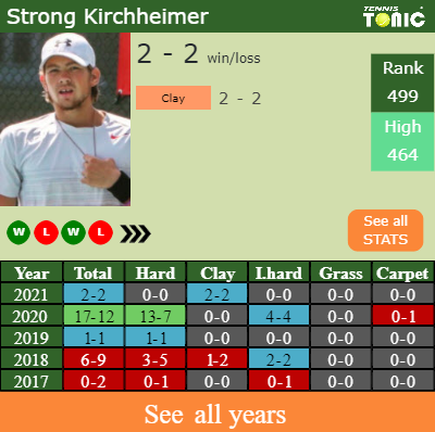 Kirchheimer has a 2-2 win-loss record in 2021, 0-0 on indoor hard courts (See FULL STATS).