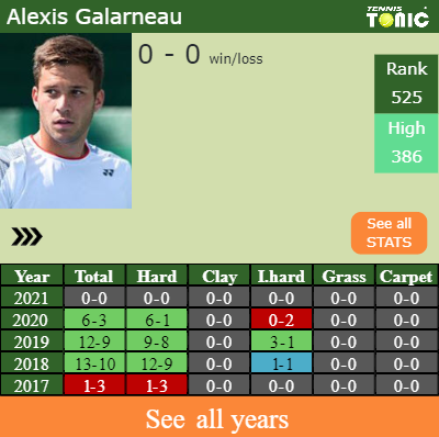 In terms of his career, Galarneau has an overall 38-34 record. He has a negative 4-6 record on indoor hard courts.