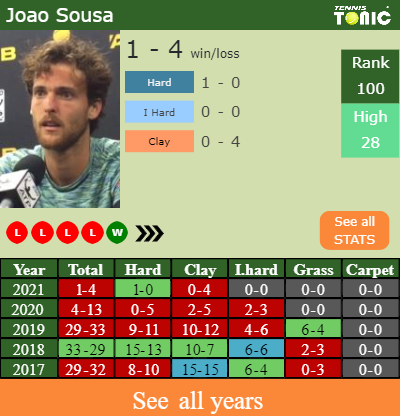 Sousa has a winning match record in the last 10 years having won 51% of his matches (289-273). 1-0 on hard in 2021. Regarding his performance on the same surface of this competition, Sousa has a 71-88 win-loss record in the last years on hard.
