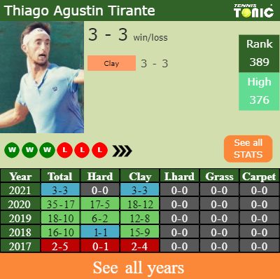 Agustin has a 3-3 win-loss record in 2021, 3-3 on clay (See FULL STATS).