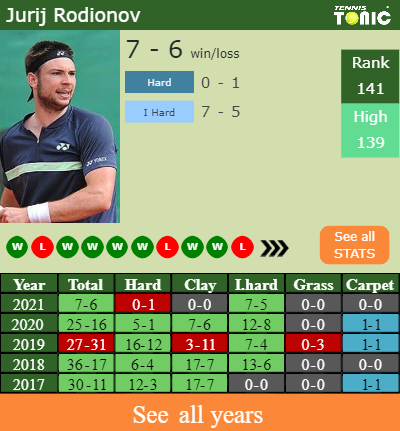 Rodionov has a 7-6 win-loss record in 2021, 7-5 on indoor hard courts (See FULL STATS).