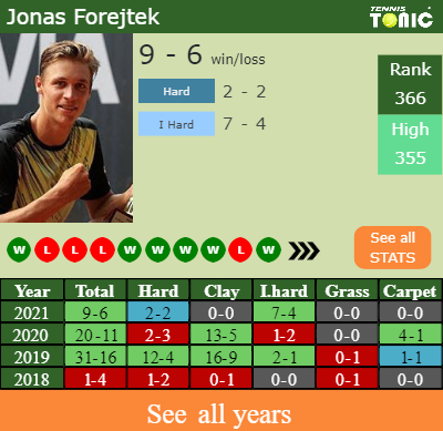 Jonas has a 9-6 win-loss record in 2021, 7-4 on indoor hard courts (See FULL STATS).