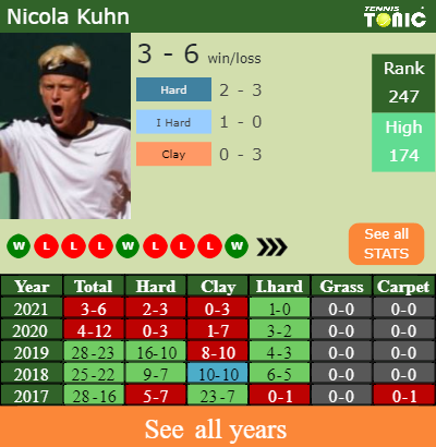 Kuhn has a winning win-loss record in the last 6 years having won 54% of his matches (108-91). 1-0 on indoor hard courts in 2021. Regarding his performance on the same surface of this tournament, Kuhn has a 14-11 win-loss record in the last 6 years on indoor hard courts.