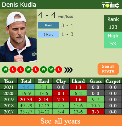 Kudla has a positive match record in the last 10 years having won 57% of his matches (326-244). 3-1 on hard in 2021. Talking about his performance on the same surface of this event, Kudla has a 154-120 match record in the last years on hard.