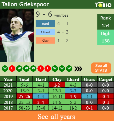 Tallon has a 9-6 win-loss record in 2021, 4-1 on hard (See FULL STATS).
