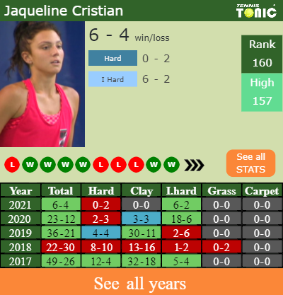Cristian has a solid record in the last 7 years having won 61% of her matches (193-124). 6-2 on indoor hard courts in 2021. In connection with her performance on the same surface of this event, Cristian has a 32-21 match record in the last 7 years on indoor hard courts.