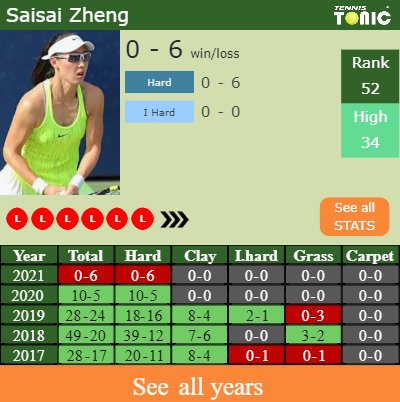 Zheng has a 0-6 win-loss record in 2021, 0-6 on hard (See FULL STATS).