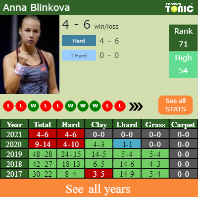 This will be the 3rd time that Anna Blinkova and Viktorija Golubic fight against each other. The head to head is 2-0 for Golubic (see full H2H stats), but they have never played each other on hard.