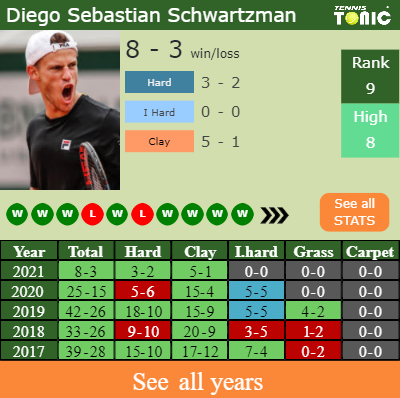 Diego has a 8-3 win-loss record in 2021, 3-2 on hard (See FULL STATS).