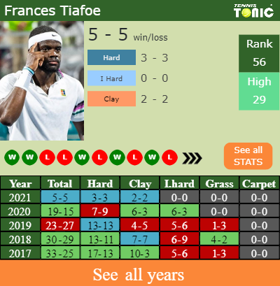 Francis has a 5-5 win-loss record in 2021, 3-3 on hard (See FULL STATS).