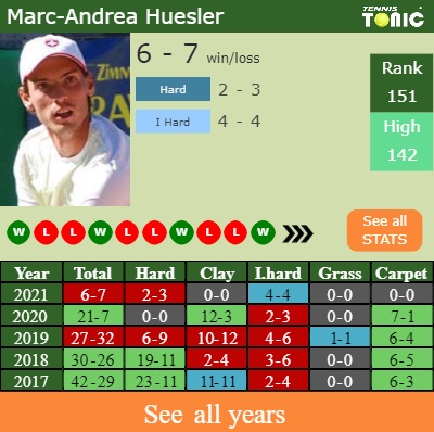 Huesler has a winning win-loss record in the last 6 years having won 56% of his matches (159-123). 4-4 on indoor hard courts in 2021. In connection with his performance on the same surface of this competition, Huesler has a 26-28 win-loss record in the last 6 years on indoor hard courts.