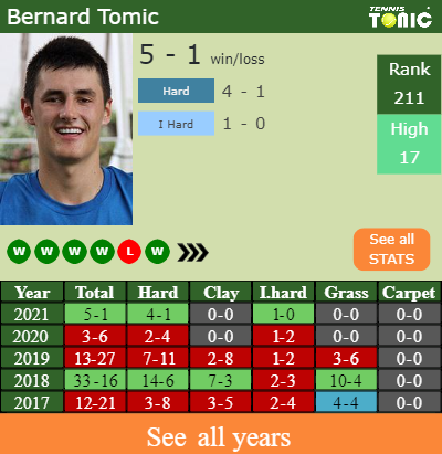 Tomic has a positive record in the last 10 years having won 54% of his matches (222-192). 1-0 on indoor hard courts in 2021. Talking about his performance on the same surface of this event, Tomic has a 24-29 record in the last years on indoor hard courts.