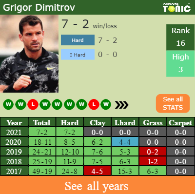 Dimitrov has a solid match record in the last 10 years having won 63% of his matches (318-188). 7-2 on hard in 2021. Talking about his performance on the same surface of this event, Dimitrov has a 145-90 match record in the last years on hard.