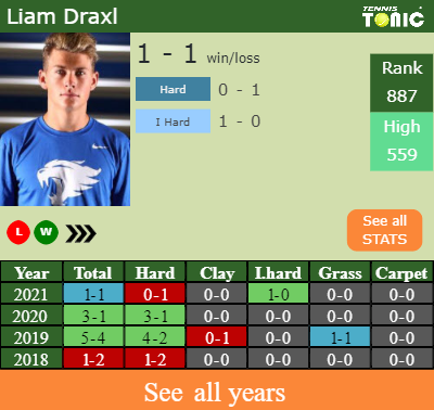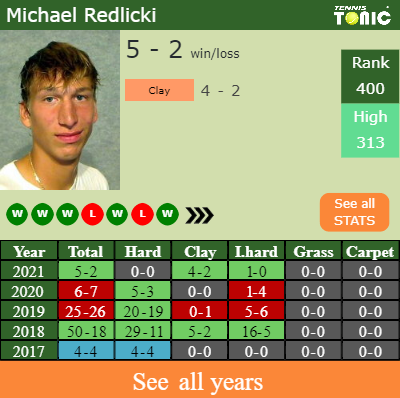Redlicki has a winning win-loss record in the last 7 years having won 59% of his matches (102-72). 1-0 on indoor hard courts in 2021. In connection with his performance on the same surface of this event, Redlicki has a 23-15 record in the last 7 years on indoor hard courts.