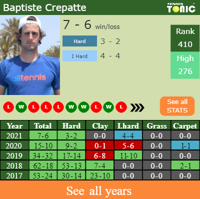 Crepatte has a 7-6 win-loss record in 2021, 4-4 on indoor hard courts (See FULL STATS).