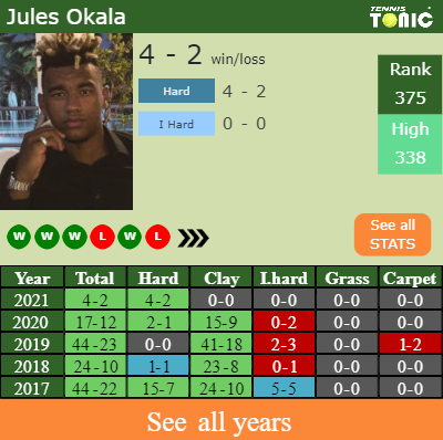 Talking about his overall career, Okala has an overall 168-95 record. He has a negative 8-14 record on indoor hard courts.