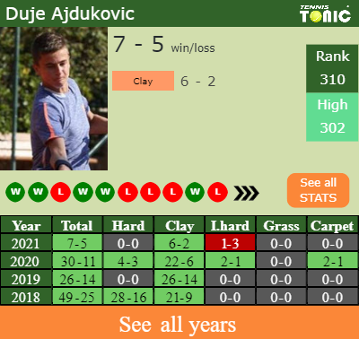 Ajdukovic has a 7-5 win-loss record in 2021, 6-2 on clay (See FULL STATS).