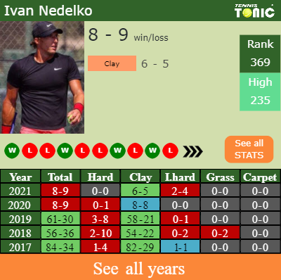 The Russian has a 8-9 win-loss record in 2021, 6-5 on clay (See FULL STATS).
