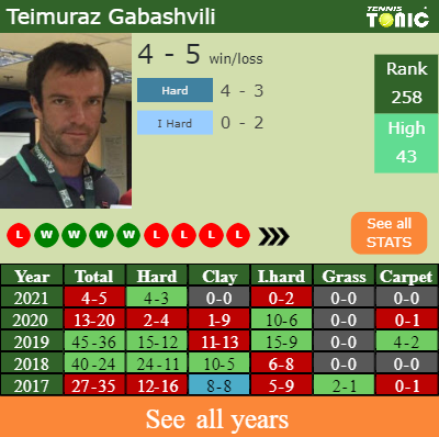 Talking about his overall career, Gabashvili has an overall 610-542 record. He has a positive 262-214 record on clay.
