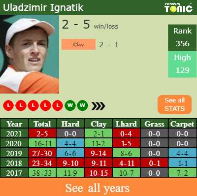 Uladzimir has a 2-5 win-loss record in 2021, 2-1 on clay (See FULL STATS).