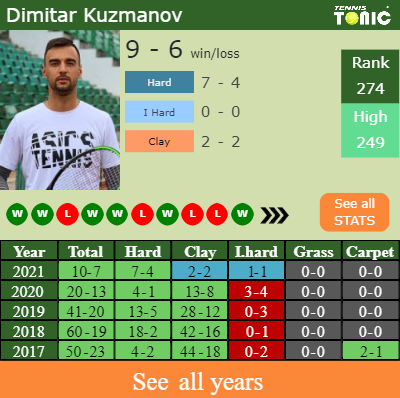 Dimitar has a 10-7 win-loss record in 2021, 2-2 on clay (See FULL STATS).