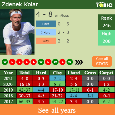 Kolar has a 4-8 win-loss record in 2021, 2-2 on clay (See FULL STATS).