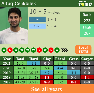 Celikbilek has a 10-5 win-loss record in 2021, 9-4 on indoor hard courts (See FULL STATS).