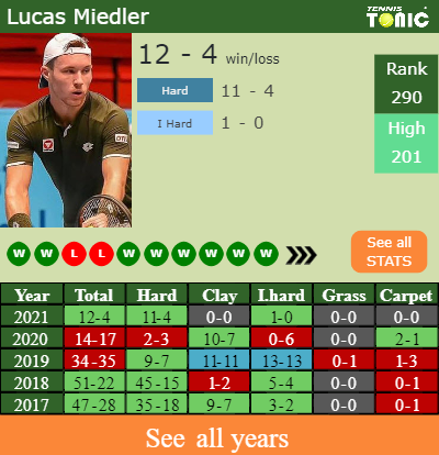 Miedler has a 12-4 win-loss record in 2021, 1-0 on indoor hard courts (See FULL STATS).