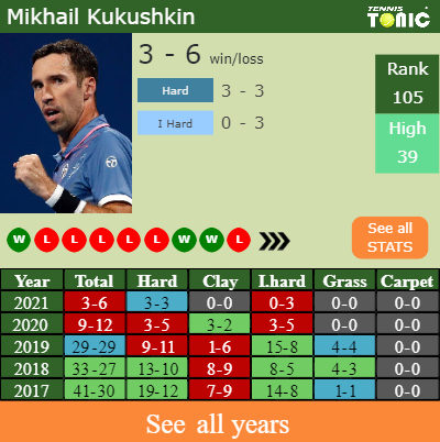 Kukushkin has a 3-6 win-loss record in 2021, 3-3 on hard (See FULL STATS).