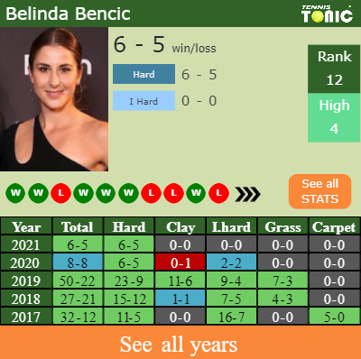 Talking about her overall career, Bencic has an overall 301-157 record. She has a positive 139-78 record on hard.