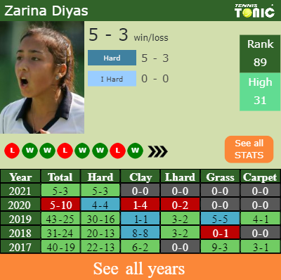 Zarina has a 5-3 win-loss record in 2021, 5-3 on hard (See FULL STATS).