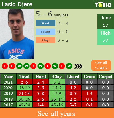 The Serbian has a 5-6 win-loss record in 2021, 2-4 on hard (See FULL STATS).