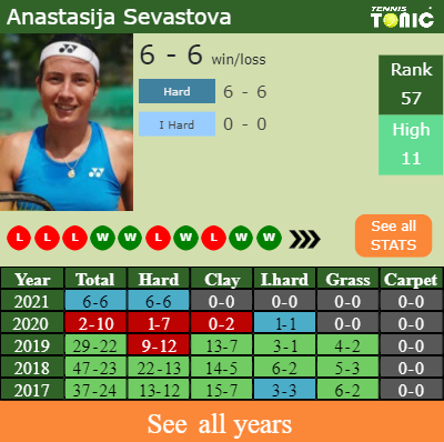 Sevastova has a 6-6 win-loss record in 2021, 6-6 on hard (See FULL STATS).