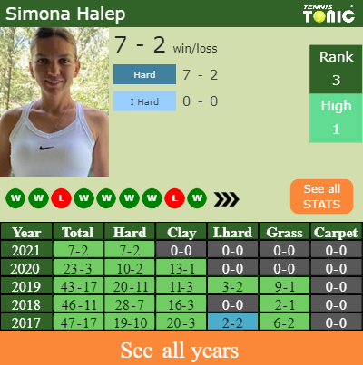 Halep has a 7-2 win-loss record in 2021, 7-2 on hard (See FULL STATS).