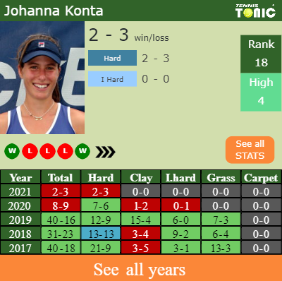 Konta has a 2-3 win-loss record in 2021, 2-3 on hard (See FULL STATS).