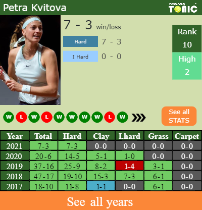 Kvitova has a terrific record in the last 10 years having won 70% of her matches (353-148). 7-3 on hard in 2021. Regarding her performance on the same surface of this competition, Kvitova has a 203-86 match record in the last years on hard.