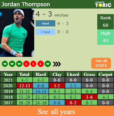 Thompson has a 4-3 win-loss record in 2021, 4-3 on hard (See FULL STATS).