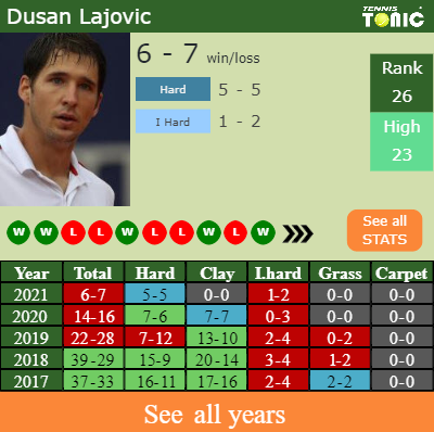 Lajovic has a 6-7 win-loss record in 2021, 5-5 on hard (See FULL STATS).