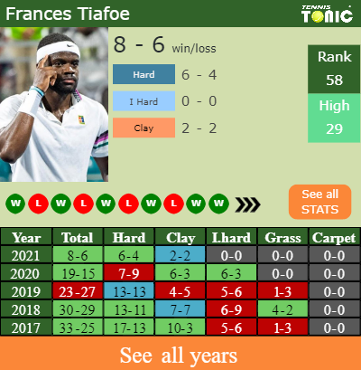 Francis has a 8-6 win-loss record in 2021, 6-4 on hard (See FULL STATS).
