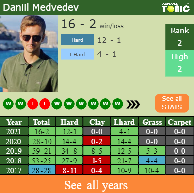 Medvedev has a solid match record in the last 9 years having won 69% of his matches (332-150). 12-1 on hard in 2021. Talking about his performance on the same surface of this competition, Medvedev has a 134-50 match record in the last 9 years on hard.