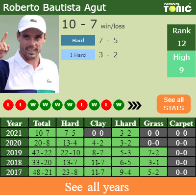 Bautista-Agut has a solid match record in the last 10 years having won 65% of his matches (375-203). 7-5 on hard in 2021. Talking about his performance on the same surface of this event, Bautista-Agut has a 164-82 record in the last years on hard.